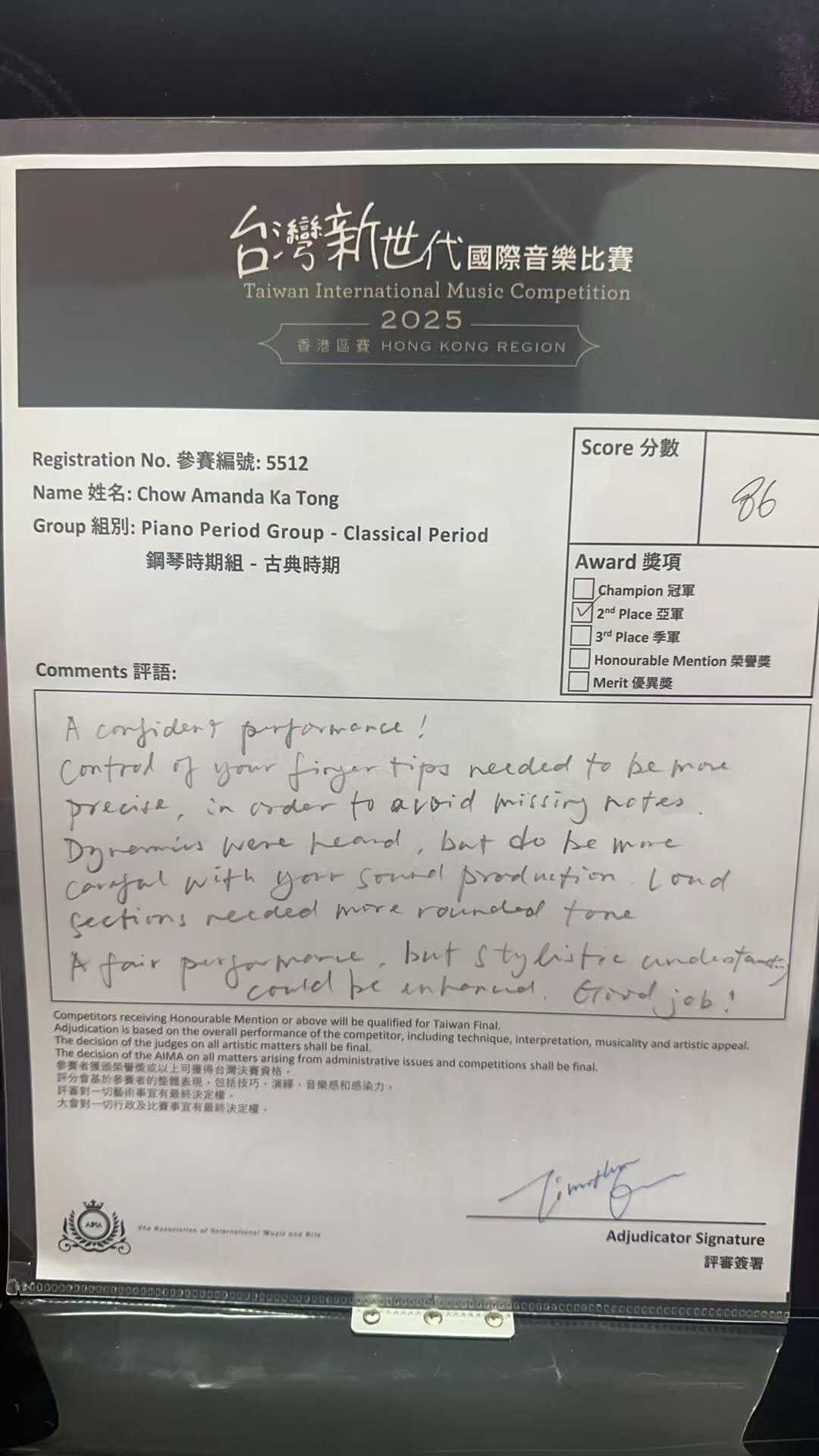 周同學參加新世代國際音樂比賽 喜獲第二名 (第一名空缺)祝賀