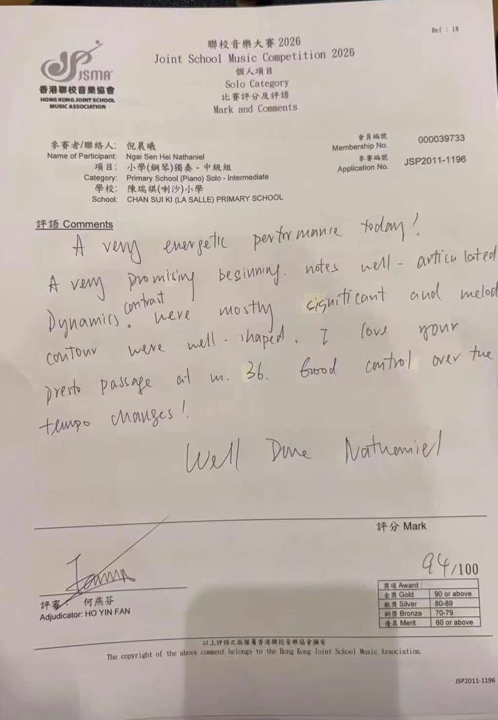 祝賀達韻學生倪晨曦以94分在聯校音樂大賽2026小學(鋼琴)獨奏中級組獲得金獎。